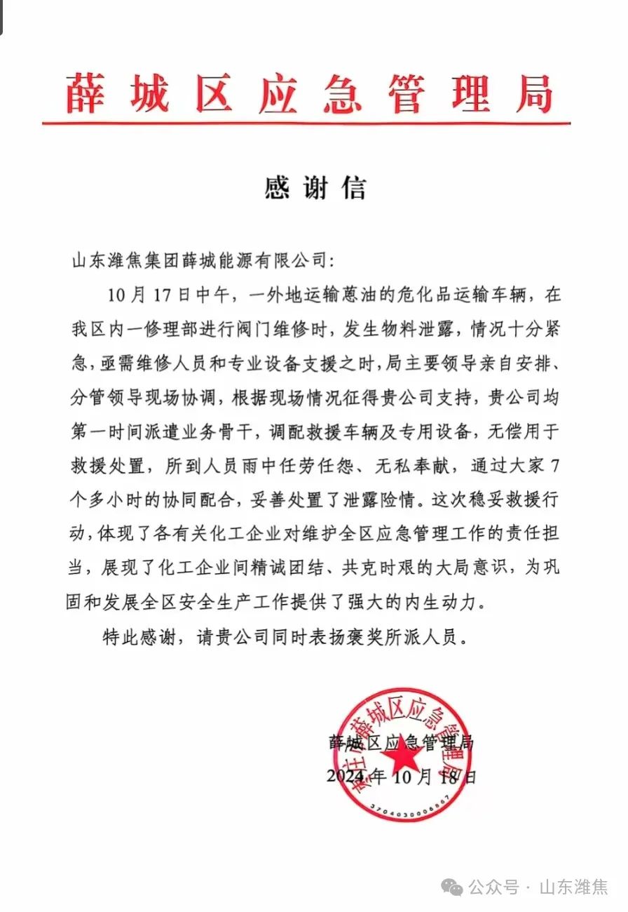 10月17日中午,一外地運輸蒽油的?;愤\輸車輛,在薛城區(qū)一車輛修理部進行閥門維修時,突發(fā)?;肺锪闲孤┦鹿剩闆r十分緊急,薛城能源公司接訊后,派遣業(yè)務(wù)骨干,調(diào)配救援車輛及專用設(shè)備,無償用于救援處置。參加救援人員冒雨操作,任勞任怨、無私奉獻,經(jīng)過7個多小時的協(xié)同配合、緊急救援,?;沸孤╇U情成功妥善處置。