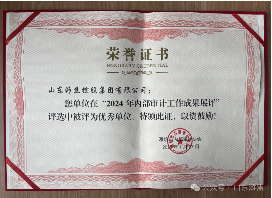 近日,濰坊市內(nèi)部審計(jì)協(xié)會(huì)組織2024年全市內(nèi)部審計(jì)工作成果展評(píng),集團(tuán)公司榮獲“2024年內(nèi)部審計(jì)工作成果展評(píng)優(yōu) 秀單位”稱(chēng)號(hào)。