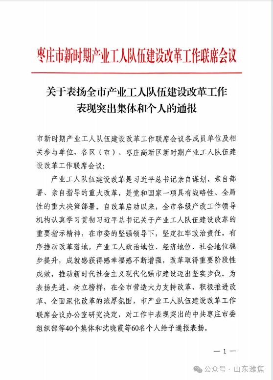 11月27日,棗莊市新時期產業(yè)工人隊伍建設改革工作聯(lián)席會議公布表彰名單,薛城能源公司榮獲“棗莊市產業(yè)工人隊伍建設改革工作表現(xiàn)突出集體”稱號。